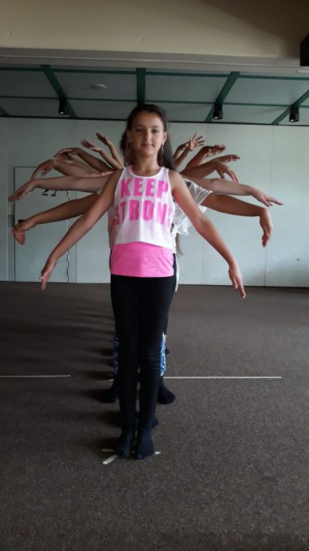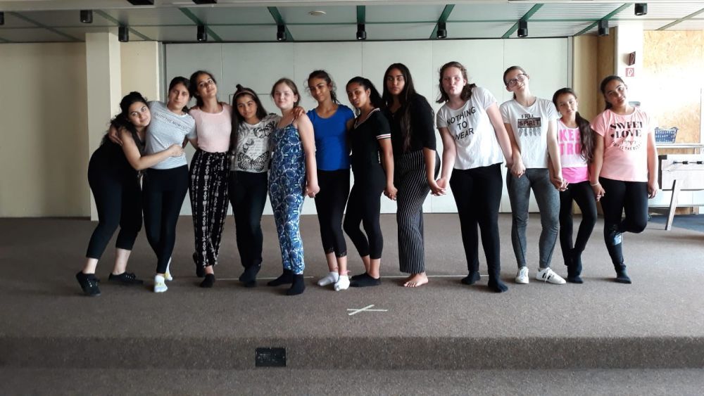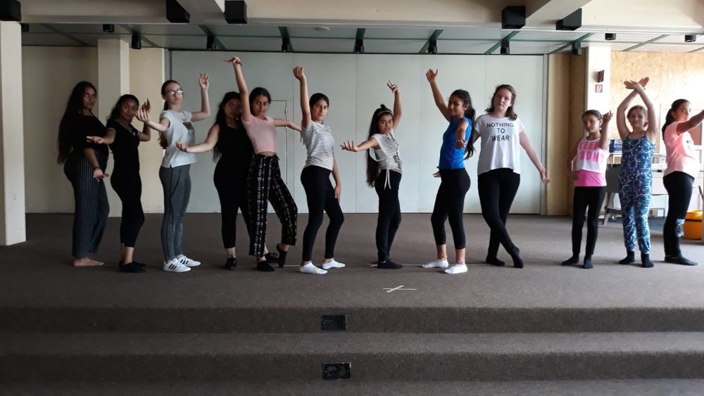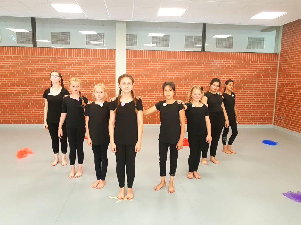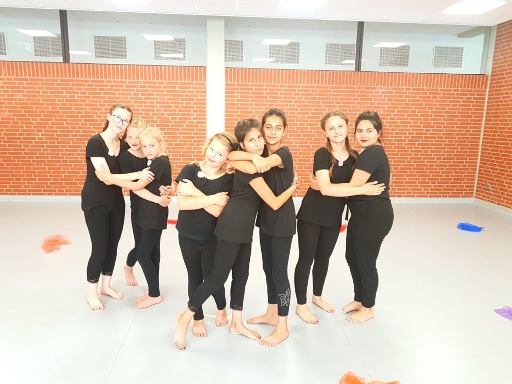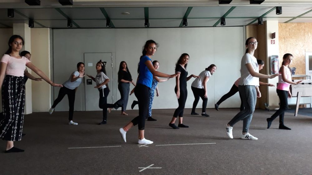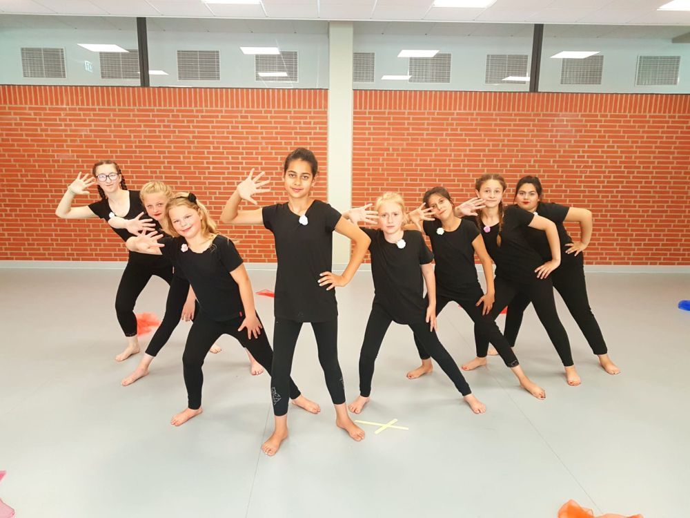 In der Tanztheater AG gestalten acht bis 12 Schülerinnen der 5.-7. Klassen zu einem bestimmten Thema eine Eigenproduktion. Bisher wurden die Themen "Freundinnen" und "Gehen wir aufeinander zu" aufgegriffen und mit ästhetischen Mitteln bearbeitet. Kleine Texte und die Musik helfen dabei, dass die Schülerinnen kreativ werden und eigene Bewegungsideen umsetzen können. Das ganze Schuljahr wird auf eine Aufführung hin gearbeitet. Die Belohnung am Ende des Projektes ist der Applaus des Publikums. Die Tanztheater AG wird im Schuljahr 2019/20 wieder angeboten.