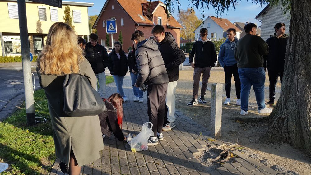 Zu der Gedenkaktion gehörte wie im letzten Jahr die Renigung der Stolpersteine in der Quakenbrücker Innenstadt. Die Oberschülerinnen und Oberschüler gedachten dabei besonders an
